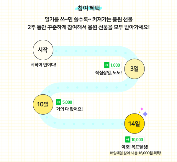 5월 1일 토요일부터 5월 14일 금요일까지 2주 동안 하루도 빠짐없이 블로그에 일기를 남기면 네이버페이 포인트를 최대 16,000원 지급하겠다는 겁니다.