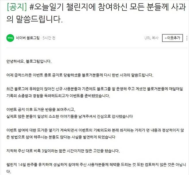하지만 이벤트 시작 3일 만인 어제(3일), 네이버 블로그팀은 챌린지 조기 종료를 공지했습니다.