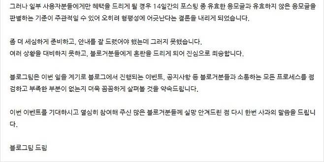 네이버 블로그팀은 여러 상황을 대비하지 못하고 참여자에게 혼란을 주어 죄송하다고 거듭 사과했지만, 참여했던 누리꾼들의 화는 쉽게 사그라들고 있지 않습니다.