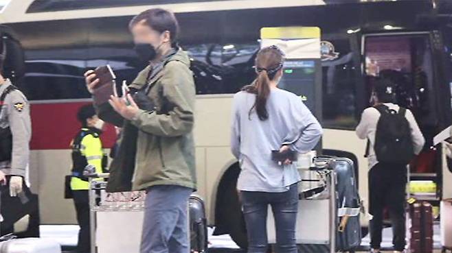 마스크에 얼굴 가리개까지 쓴 우리 교민들이 인천공항 입국장에 들어섭니다.