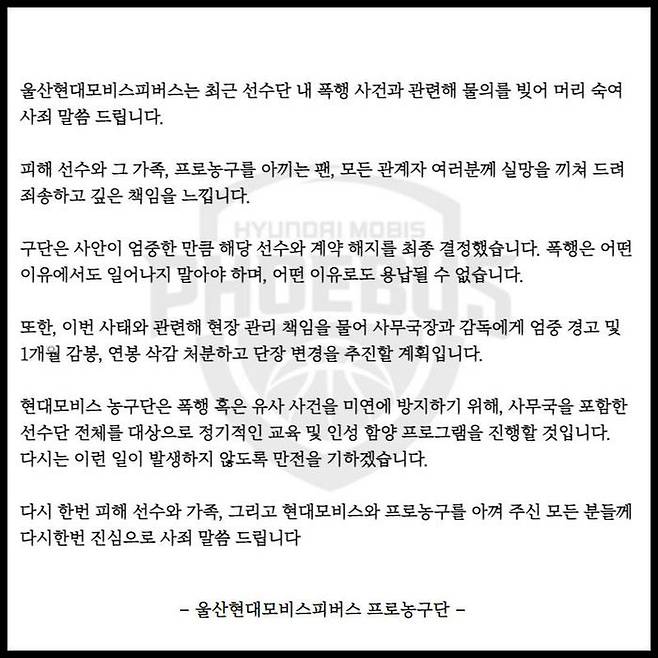 현대모비스는 "최근 선수단 내 폭행 사건과 관련해 물의를 빚어 머리 숙여 사죄 말씀드린다"며 "현장 관리 책임을 물어 단장 변경을 추진하고 감독과 사무국장에게 엄중 경고 및 1개월 감봉, 연봉 삭감 등의 조치를 할 계획"이라고 발표했습니다.