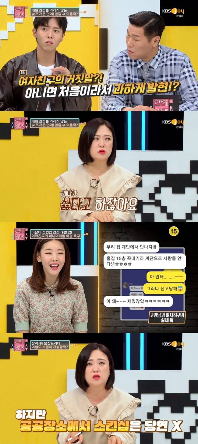 이날 사연자는 첫 연애인 여자친구와 스킨십 진도에 대한 고민을 보냈다. 여자친구가 스킨십에 과도하게 집착하며 아파트 계단, 골목 등 장소와 시간을 가리지 않고 들이댄다는 것.