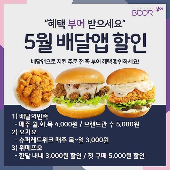 치킨 프랜차이즈 '부어치킨'이 5월 배달앱 할인소식을 전했다.