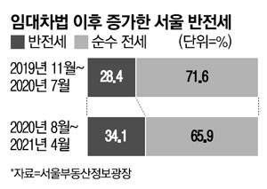 5일 서울부동산정보광장에 따르면 계약갱신청구권제와 전월세상한제를 도입한 새 임대차법 시행 이후 작년 8월부터 지난달까지 9개월간 서울의 아파트 전월세 거래는 총 12만1180건으로 집계됐다. 이 가운데 보증금 외에 매달 일정액을 추가로 지불하는 반전세·월세는 4만1344건으로, 전체 임대차 거래의 34.1%를 차지했다. 임대차법 시행 직전 9개월(재작년 11월∼작년 7월)간 28.4%였던 것과 비교하면 5.7%포인트 증가한 것이다. 즉 순수 전세 비중은 71.6%에서 65.9%로 감소했다.