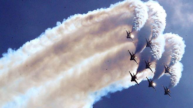 사회자는 축하 비행을 진행하며 "블랙이글스가 대한민국 조종사들의 높은 기량과 항공 기술의 우수성, 뛰어난 정비가 합쳐진 결정체"라고 소개했습니다.