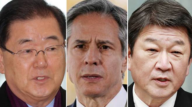 정의용 외교장관과 토니 블링컨 미국 국무장관, 모테기 도시미쓰 일본 외무상은 이날 오전 런던 시내 호텔에서 회담을 시작했습니다.