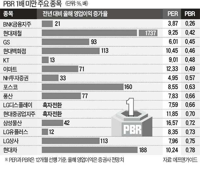 PBR이 낮은 종목 중에서도 선별 작업이 필요하다. 5일 시장정보업체 에프앤가이드에 따르면 유가증권시장 상장사 중 PBR이 가장 낮은 종목은 한국전력이다. 12개월 선행 PBR은 0.22배다. 한전은 전년 동기 대비 올해 영업이익이 50% 줄어들 것으로 전망된다. 12개월 선행 PER은 30.63배로 치솟았다. 수익으로 보면 싸지 않은 주식이다.