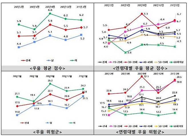 우울 평균 점수는 코로나19 사태 초기인 지난해 3월 첫 조사 때 5.1점에서 지난해 9월 5.9점, 12월 5.5점, 올해 3∼4월 5.7점 등으로 전반적으로 증가세를 보이고 있습니다.