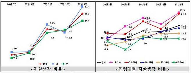자살 생각을 하는 사람의 비율도 지난해 3월 9.7%에서 같은 해 9월 13.8%, 올해 3∼4월 16.3%로 높아졌습니다.