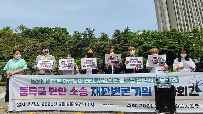 전국대학학생회네트워크가 주축이 된 '2021 등록금반환운동본부'는 오늘(6일) 서울중앙지법 앞에서 기자회견을 열고 "각 대학이 소송 취하를 요구하면서 교육기관의 책임과 역할을 저버렸고 정부도 이를 관리 감독할 책임을 회피하고 있다"며 이같이 밝혔습니다.