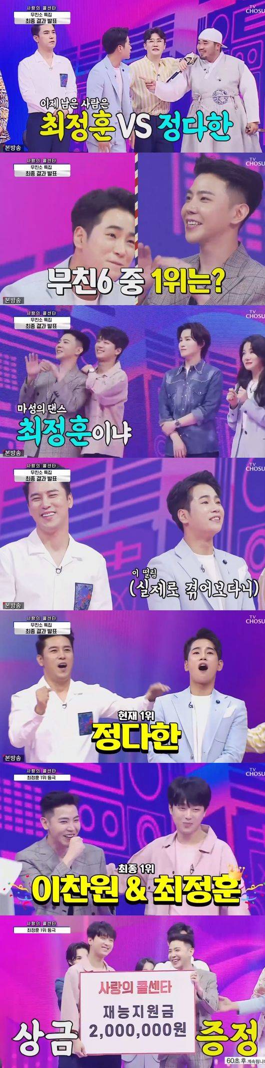 [OSEN=김수형 기자] '사랑의 콜센타'에서 최정훈이 이찬원의 추가 점수를 받아 정다한을 제치고 최종 우승했다.
