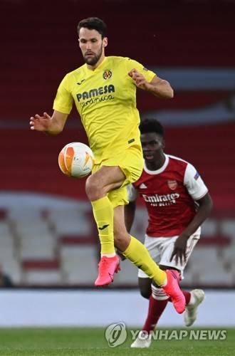 epa09181805 Villarreal's Alfonso Pedraza in action during the UEFA Europa League semi final, second leg soccer match between Arsenal FC and Villarreal CF in London, Britain, 06 May 2021. EPA/ANDY RAIN