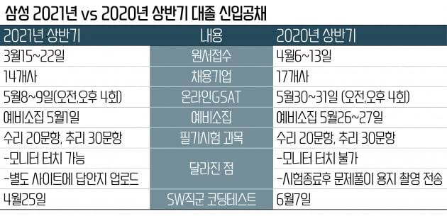 삼성그룹의 올해 상반기 대졸신입사원(3급) 공채 필기시험인 '삼성직무적성검사(GSAT)'가 이번 주말 8~9일 이틀간 실시한다. 지난해 상반기 공채시험(5월 30~31일)보다 23~24일 빨라졌다. GSAT일정이 앞당겨 지면서 이후 각 계열사 면접은 5월 중하순부터 진행될 것으로 전망된다. 지난해 상반기 처음 도입된 온라인GSAT은 올해 공채가 세번째다. 삼성전자·삼성SDS의 소프트웨어(SW)직군의 코딩테스트는 2주일 전인 4월25일 실시했다.