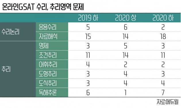 문제의 난도와 관련해서 추리영역은 비교적 평이한 수준이나, 수리영역은 여전히 까다로운 것으로 알려졌다. 에듀윌이 분석한 2020년 하반기 GSAT 출제경향에 따르면, 수리논리 영역은 응용수리 2문항, 자료해석 18문항이 출제됐다. 추리영역은 명제 3문항, 조건추리 11문항, 어휘추리 2문항, 도형추리 3문항, 도식추리 4문항, 독해추론 7문항 등이 출제된 것으로 파악됐다.