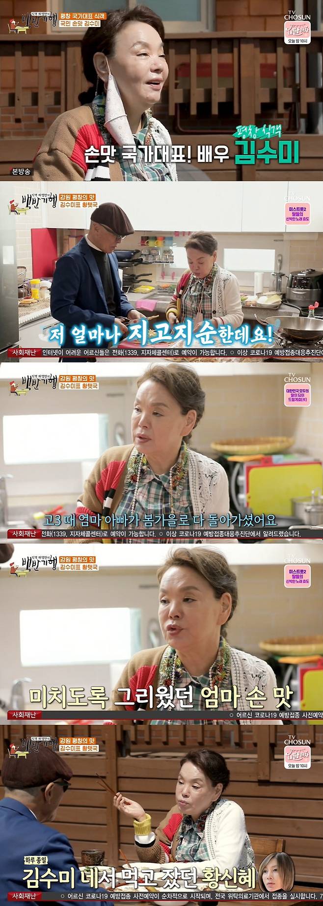 7일 방송된 TV조선 예능프로그램 '허영만의 백반기행'에서는 배우 김수미가 평창에 출격해 허영만에게 한상을 대접했다.