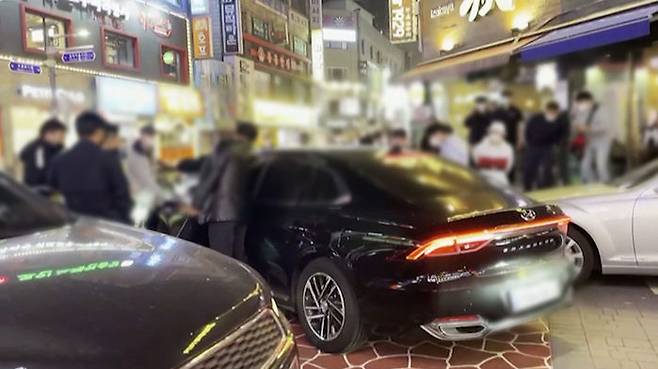 어젯(7일)밤 9시 10분쯤 서울 송파구 방이동 먹자골목 거리에서 승용차가 행인을 친 뒤 움직이려 하자, 시민들이 운전자를 붙잡았습니다.