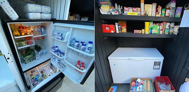 냉장고를 둘러싼 나무 구조물에는 팬트리 공간이 있다. 통조림과 보존식품도 넣어둘 수 있다. 또 화장실 휴지, 분유, 기저귀, 샴푸, 위생용품, 마스크 등 음식 외의 물품들을 보관하는 공간도 따로 마련돼 있다.