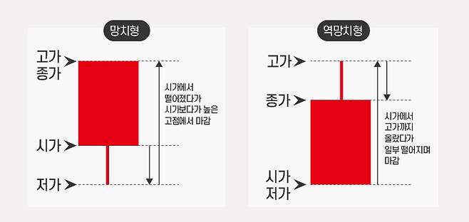 양봉 '망치형'은 최고가가 장중에 시가보다 낮은 가격으로 떨어진 적이 있지만 떨어진 가격으로 매수하는 사람이 많아 그날 시가보다 더 많이 오른 상태로 장이 마감된 경우입니다. 상승 여력이 크다고 해석할 수 있겠죠. 반대로 '역망치형'은 장중에 시가보다 주식 가격이 떨어진 적은 없지만 고가에서 매도하는 사람이 늘면서 주가가 그날 최고가보다 하락한 지점에서 장이 마감된 경우입니다. 상승 이후 시세 차익을 노린 매물들이 나온 경우에도 이런 모양이 되기도 합니다.