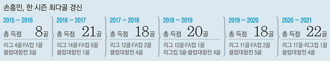 아울러 손흥민은 리그컵(카라바오컵) 1골, 유럽축구연맹(UEFA) 유로파리그 4골(예선 1골 포함)까지 더해 시즌 공식전 합계 22번째 골을 기록, 2016~2017시즌의 21골을 넘는 개인 한 시즌 공식전 최다 골 신기록까지 세웠다.