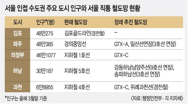 김포보다 인구가 적은 하남시(30만명)만 해도 현재 지하철 5호선이 개통돼 있고, 앞으로도 지하철 9호선과 3호선의 연장 노선 개발이 추진된다. 김포와 인구가 비슷한 파주(48만명)와 의정부(46만명) 역시 서울까지 연결되는 경의중앙선과 지하철 1호선이 개통된 상황임에도 각각 GTX-A 노선과 3호선 연장(이상 파주), GTX-C노선(의정부) 개발이 추후 예정돼 있다. 인구가 6만여명에 그친 과천은 지하철 4호선이 있는 상황에서도 GTX-C와 위례과천선(경전철)이 추가 신설될 예정이다.