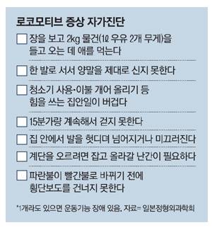 히구치 미쓰루 교수는 "나이를 먹으면서 근육량과 근력이 감소하고 걷는 속도가 늦어지는 등 운동·신체기능 장애가 생기는 것을 '사르코페니아(sarcopenia·그리스어로 근육(sarco)과 상실(penia)을 뜻하는 단어 합성어)'라고 한다"면서 "고령자의 약 10~15%가 사르코페니아를 앓고 있다고 추정되며 남성은 80세, 여성은 75세를 지나면 환자가 급증한다"고 말했다. 치료법은 약이 없는 만큼, 운동과 단백질 위주의 식이요법 병행이 최선이다. 근육을 비롯해 관절, 연골, 추간판과 같은 운동기관이 약해져 운동 기능이 저하된 상태를 '로코모티브 신드롬(locomotive syndrome·운동기능저하증후군)'이라고 한다.