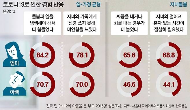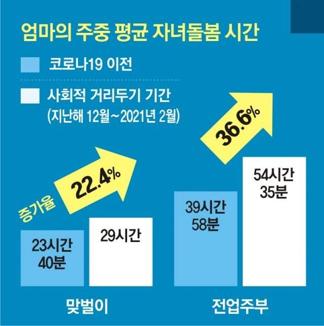 전업주부의 스트레스도 극심하다. 전업주부는 기존에도 자녀 돌봄의 부담이 집중돼 힘겨웠지만, 코로나19 이후 돌봄 시간이 절대적으로 늘었을 뿐 아니라 일의 강도도 훨씬 커졌다. 설문에 응한 전업주부는 돌봄 시간이 1일 평균 약 3시간씩 늘어 총 11시간에 이르렀다.