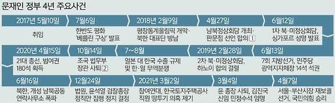 문재인정부를 관통하는 결정적 사건을 꼽아 달라는 질문에 9일 정치 전문가 5인은 모두 ‘조국 사태’를 꼽았다. 2019년 한국사회를 둘로 나눴고, 현재까지 영향력을 미치고 있어서다. 10일 문재인 대통령 취임 4주년 특별연설 후 이어질 기자들의 질의응답에서도 ‘조국 사태’와 관련한 질문이 등장할 것으로 보인다.