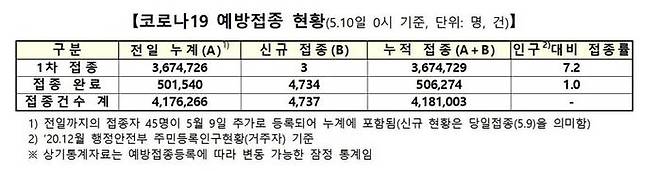 국내 누적 1차 접종자는 총 367만4천729명으로, 전체 인구(5천134만9천116명) 대비 7.2%입니다.