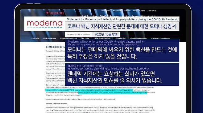 모더나도 이런 상황을 모르는 게 아닙니다. 지난해 10월 성명서를 내고 특허권을 주장하지 않을 것이고, 요청하는 기업이 있으면 백신 지재권 면허를 발급해 줄 의사가 있다고 발표하기도 했습니다. 물론 최근 미국 정부의 지재권 면제 선언에 대해서는 불편한 심기를 내비쳤습니다. 스테판 방셀 CEO가 투자자들과 통화에서 잠을 한잠도 못 잤다며, 백신 생산을 더 많이 하는 데 지재권 면제가 도움이 되지 않는다고 반대 입장을 표시했습니다. 미국 정부가 구체적인 행동에 나설 기미를 보이자 반대한다는 메시지는 명확하게 내보인 것입니다. 하지만 모더나에 대해서는 미국 정부가 충분한 지분을 가지고 있고, 마음만 먹으면 정부가 원하는 방식으로 기업을 움직일 수 있는 것도 사실입니다.