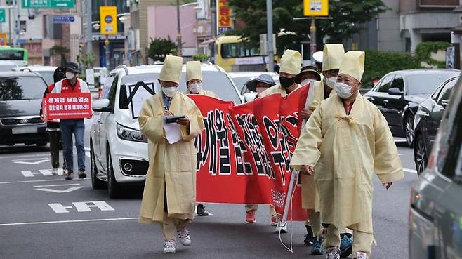 참가자들은 "코로나19 방역에 따른 집합금지 명령으로 무려 10개월 동안 영업을 하지 못했다"며 "수입이 없어져 임대료와 공과금 등을 수개월 밀리고 극심한 생활고를 견디다 못해 5명의 회원 업주가 극단적인 선택을 했다"고 주장했습니다.