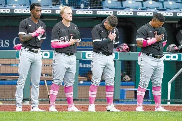시카고 화이트삭스 선수들이 9일(현지 시간) 미국 미주리주 캔자스시티 코프먼 스타디움에서 열린 캔자스시티와의 메이저리그 방문경기를 앞두고 분홍색이 들어간 유니폼을 입은 채 국민의례 행사에 참가하고 있다.