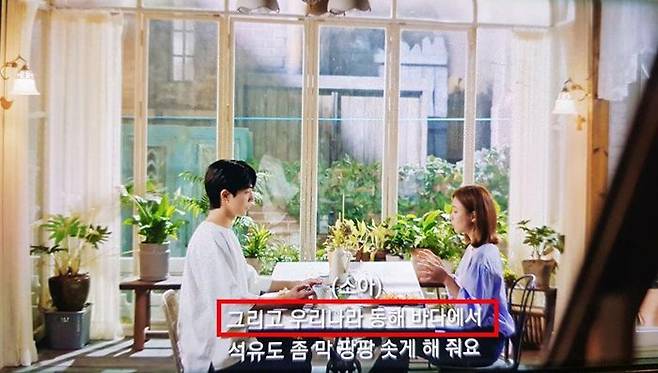 문제의 자막은 드라마 11화 51분쯤 등장했습니다. '우리나라 동해 바다에서 석유도 좀 막 팡팡 솟게 해주세요'라는 대사가 나오는데, 여기서 동해라는 단어가 프랑스어 자막에서는 'La mer du Japon'로 번역된 겁니다.