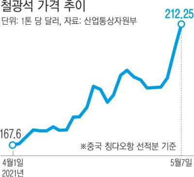 최근 철광석 가격은 지난 7일 중국 칭다오항 선적분 기준(CFR) t당 212.25달러를 기록하며 역대 최고치를 경신했다. 전날 사상 처음 200달러를 돌파한 지 하루 만이다. 연초 대비 30% 가까이 상승한 것으로, 1년 전인 지난해 5월 초의 2.5배 수준이다.