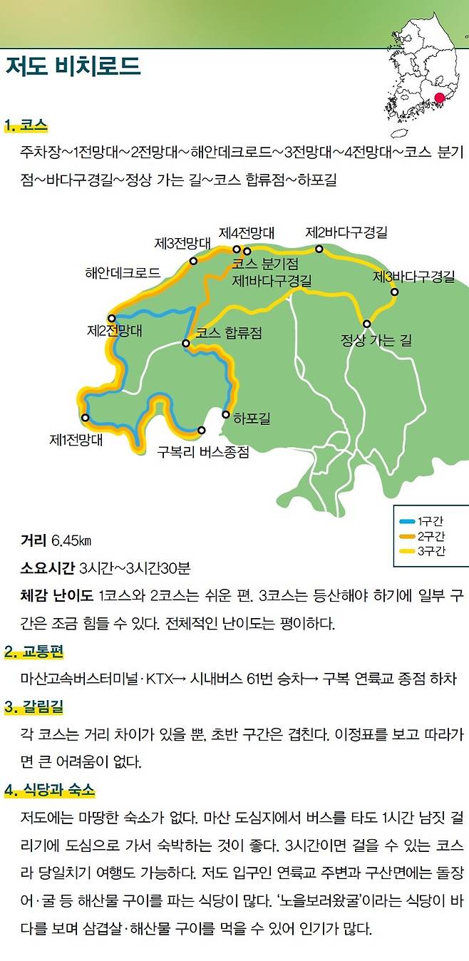 경남 창원시 마산합포구 구산면에 있는 저도는 남북 길이 1750m, 동서 너비 1500m로 넓지 않은 섬이다. ‘저도 비치로드’는 2010년 조성된 둘레길이다. 둘레길이 만들어지면서 섬 가운데엔 해발 202m 용두산으로 가는 등산로가 생겼고, 해안선을 따라 목재데크를 깔아 끊어졌던 길도 이어졌다. 이 길이 생긴 뒤 관광객의 발길이 끊이지 않는다.