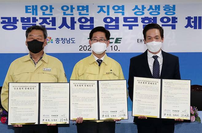 지난 10일 양승조 충청남도지사, 가세로 태안군수, 김권성 태안안면클린에너지 대표 등 10여 명이 참여한 가운데 국내 최대 발전용량인 300㎿ 규모의 태양광발전단지를 조성하기 위한 업무협약식이 충남도청에서 진행되었다.