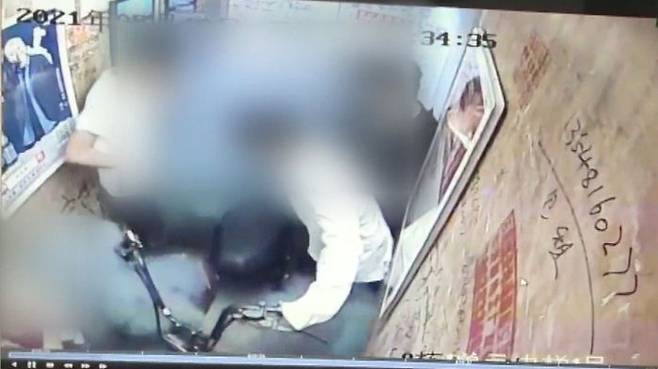 엘리베이터 안에서 갑자기 전기 이륜차가 연기를 내뿜더니 순식간에 폭발하고 맙니다.
