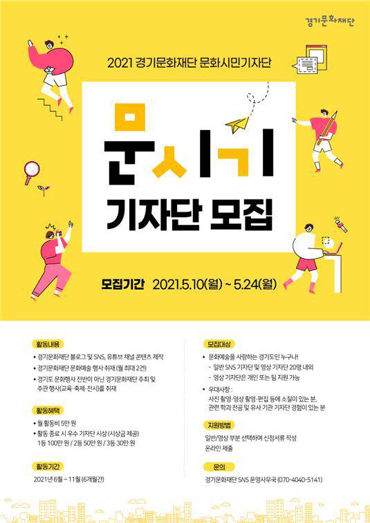 ‘경기문화재단’이 2021년 문화시민 기자단 ‘문시기’를 공개 모집한다.