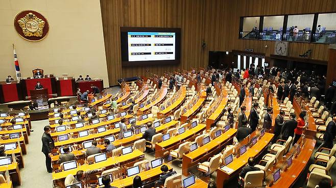 국민의힘 의원들은 표결이 시작되자 모두 본회의장에서 퇴장해 국회 로텐더홀에서 항의 구호를 외치며 오늘 본회의 개최를 강하게 비판했습니다.