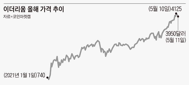이더리움의 가격은 쓰임새 확대로 인한 수요 증가에 최근 가상 화폐 투자 광풍까지 타면서 연일 상승세다. 지난 10일 처음으로 1개당 4000달러(약 450만원)를 돌파했고, 12일에는 장중 4327달러에 거래되면서 연초(740달러) 대비 488%나 올랐다. 덕분에 이더리움의 시가총액은 5025억달러(약 565조원)로, 글로벌 투자은행 JP모건체이스(4880억달러)를 제쳤다. 전체 가상 화폐 시가총액 중 이더리움이 차지하는 비율도 19.7%까지 올랐다. 비트코인(42%)에 이어 2위다. 비트코인의 비율이 50% 이하로 떨어진 것은 지난 2018년 이후 처음이다.
