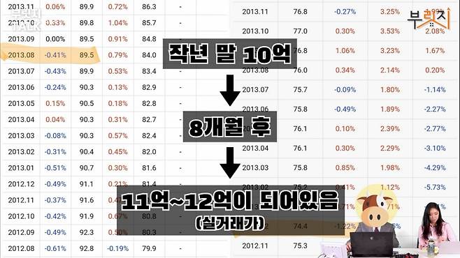 그건 조한송 기자님도 속은 거예요. 자료를 보여드릴게요. 왼쪽은 한국부동산원에서 발표한 월간 주택 가격 동향인데 2013년 8월이 저점이에요. 반면 오른쪽의 국토교통부 실거래가는 2012년 12월이 저점입니다. 이게 무슨 뜻이냐면 2013년 8월에 월간 주택 가격 동향을 보고 집을 사려고 하면 이미 실거래가는 1억~2억원 올라있다는 거예요. 2012년 12월에는 10억원이었는데, 2013년 8월 월간 주택 가격 동향이 바닥 쳤다고 해서 사려고 보니 매매가가 11억~12억원으로 올랐다는 얘기에요.