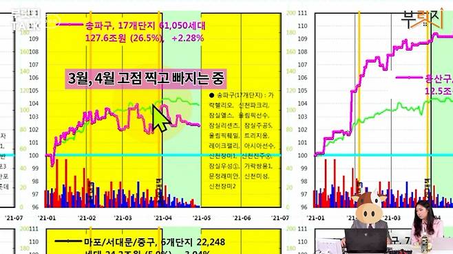 그런 거를 무시해야 해요. 통계청 데이터는 그런 걸 고려하지 않아요. 거래 건수가 1건이든 1000건이든 데이터는 데이터니까요. 저층이니 증여니, 향이 안 좋다느니 이런 거는 통계청이나 부동산원에서 고려하지 않는다고요. 만약에 지금 거래가 잘못된 거였으면 내일이라도 빨리 원상회복이 돼야죠. 예를 들어 10억원에 거래되던 아파트가 갑자기 9억원이 됐다면 뒤이어 10억원, 11억원, 9억 8000만원 이렇게 막 거래가 붙어야 해요. 근데 그렇지가 않잖아요. 이 가격이 굳어질 수 있다는 얘기예요.
