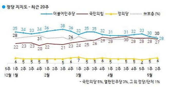 갤럽 "민주당 28% vs 국민의힘 27%..무당층 30%"