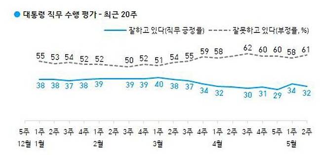 문재인 대통령 직무수행 지지도는 '잘하고 있다'가 32%로 지난주보다 2%포인트 떨어진 반면, '잘못하고 있다'는 지난주보다 3%포인트 올라 61%를 기록했습니다.