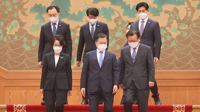 ▲ (앞줄 외쪽부터) 임혜숙 과기부 장관, 문재인 대통령, 김부겸 국무총리, (뒷줄 왼쪽부터) 문승욱 산업부 장관, 안경덕 노동부 장관, 노형욱 국토부 장관