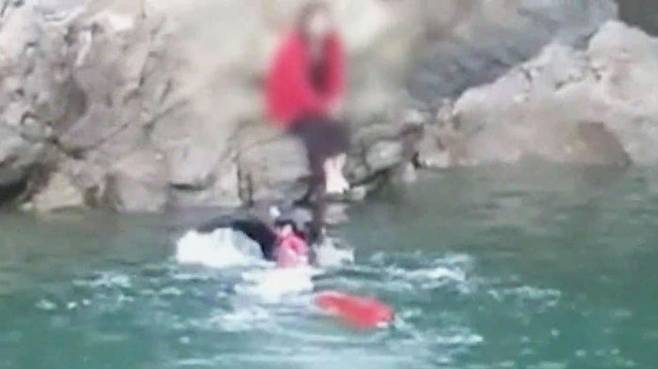 섬 갯바위에 걸터앉아있는 여성을 향해 구조대가 헤엄쳐 갑니다.
