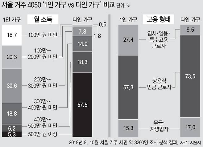서울시가 지난해 중장년 가구 약 8200명을 대상으로 한 설문조사에 따르면 1인 가구들의 소득은 100만∼300만 원 사이에 집중돼 있다. 월 100만 원 미만의 빈곤층이 18.7%, 100만∼200만 원 미만이 20.3%를 차지했다. 10명 중 7명(69.6%)은 올해 도시근로자의 1인 가구 기준 월평균 소득(299만 원)보다 낮은 수입으로 생계를 유지한다. 소득이 500만 원 이상인 경우는 5.3%에 불과했다. 이에 비해 2인 이상 함께 사는 다인 가구는 57.5%가 월소득이 500만 원 이상이었다.