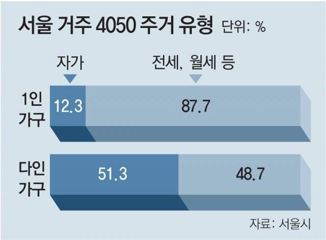동아일보 취재팀이 서울시가 지난해 서울 거주자 약 8200명을 대상으로 조사한 결과(서울서베이)를 변미리 서울연구원도시외교연구센터장과 공동분석한 결과 서울의 1인 가구(130만 가구) 중 40, 50대의 비율은 26%(33만8818가구)다. 이들의 87.7%는 전세 또는 월세 거주자다. 이에 비해 전체 서울 시민 중 전월세 거주자 비율은 57%다. 2인 이상 다인가구는 51.3%가 집을 갖고 있다.