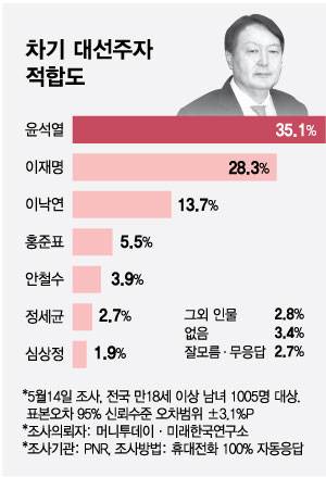 머니투데이 더300(the300)과 미래한국연구소가 PNR ㈜피플네트웍스에 의뢰해 16일 발표한 여론조사 결과 '다음 인물들 중 차기 대통령 감으로 누가 가장 적합하다고 생각하는가'라는 질문에 응답자의 35.1%가 '윤석열'을 선택해 1위를 차지했다.