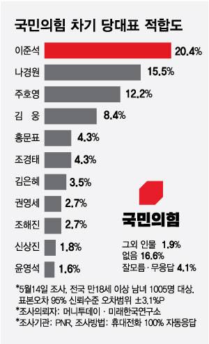 머니투데이 더300(the300)과 미래한국연구소가 여론조사기관 PNR (주) 피플네트웍스에 의뢰해 16일 발표한 여론조사에 따르면 이 전 최고위원은 국민의힘 당 대표 적합도 조사에서 20.4%로 집계됐다.