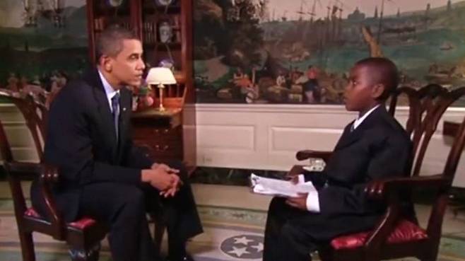 오바마 전 미국 대통령과 단둘이 앉아서 인터뷰를 진행하는 흑인 소년, 지난 2009년 초등학교 방송반 자격으로 오바마 대통령 취임식을 취재하고, 오바마 대통령과 10분간 인터뷰를 진행한 데이먼 위버라는 당시 11살이었던 소년입니다.